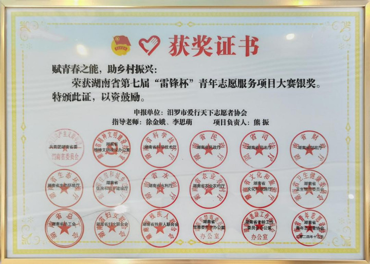 在湖南省第七届“雷锋杯”青年志愿服务项目大赛的激烈角逐中,汨罗市爱行天下志愿者协会凭借《赋青春之能,助乡村振兴》项目荣获银奖。